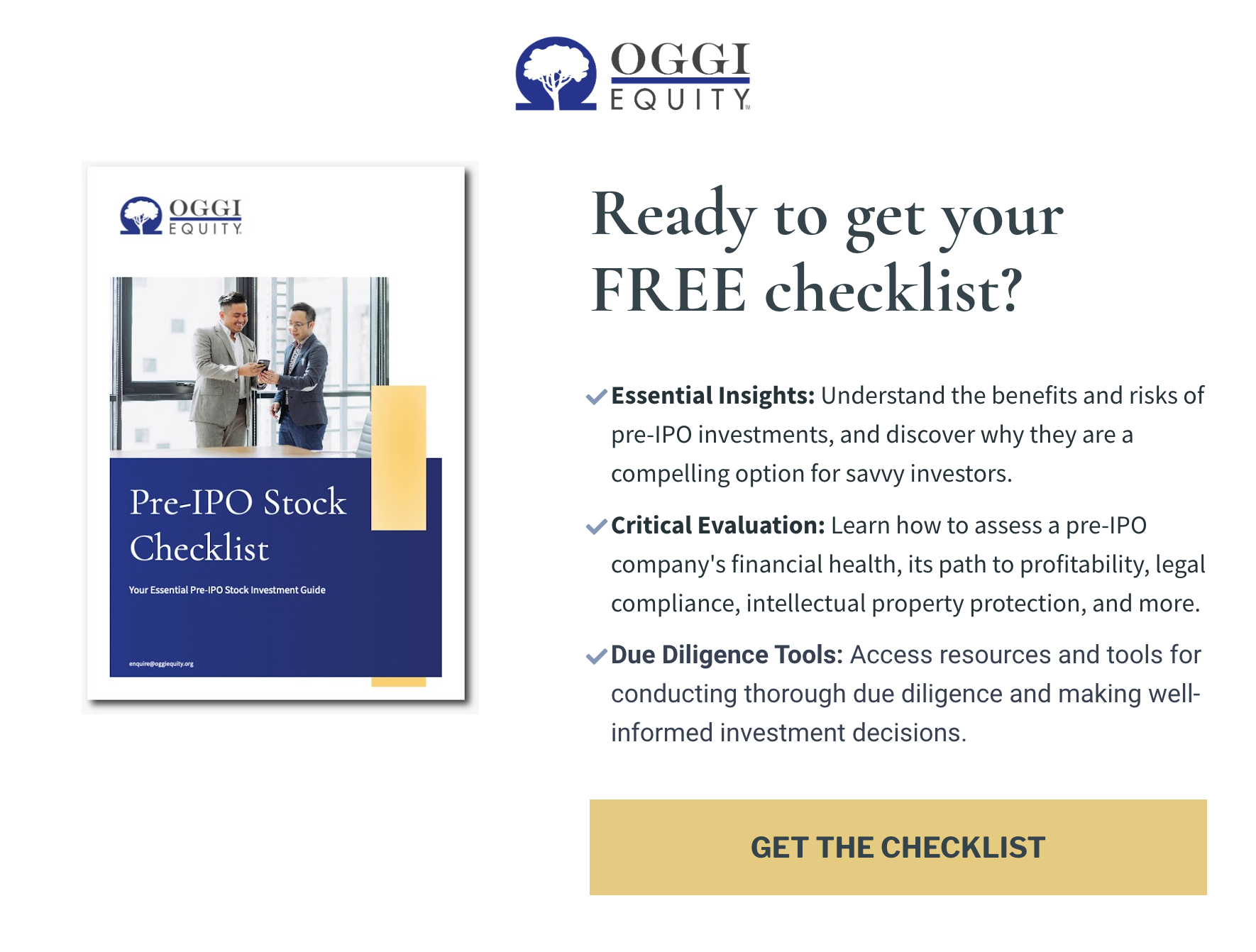 Navigating the complexities of pre-IPO investing requires expertise and careful consideration. At OGGI Equity, we specialize in identifying and evaluating high-potential pre-IPO opportunities. Contact us today to learn how we can help you make informed investment decisions and maximize your wealth potential through strategic pre-IPO investments.